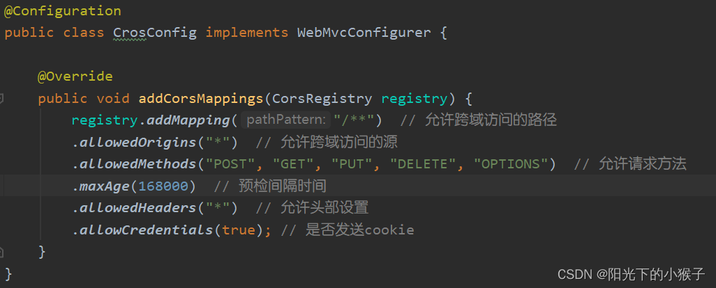According to the problem description :To allow credentials to a set of origins, list them explicitly or consider using "allowedOriginPatterns" instead, We can take allowedOrigins Change it to allowedOriginPatterns Give it a try , After modification CrosConfig.class The configuration is as follows :