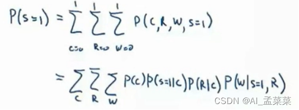 要求p(s=1)的概率,那么使用最最笨的方法就是,查左边的表,然后将s=1的情况全部加起来除以1,这个是很麻烦的为什么这么说呢,因为这必须站在上帝视角去看这件事情,因为现实生活中表肯定不会是最全的,然后还需要对表后边的一个概率进行一个计算: