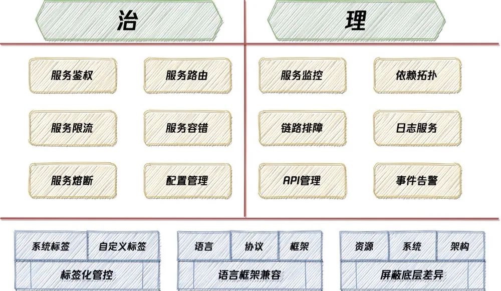 治是主动的管理动作,包括针对安全的服务鉴权,针对流量的服务限流、服务路由、服务熔断,针对可用性的服务容错,针对配置的应用配置、日志配置等。