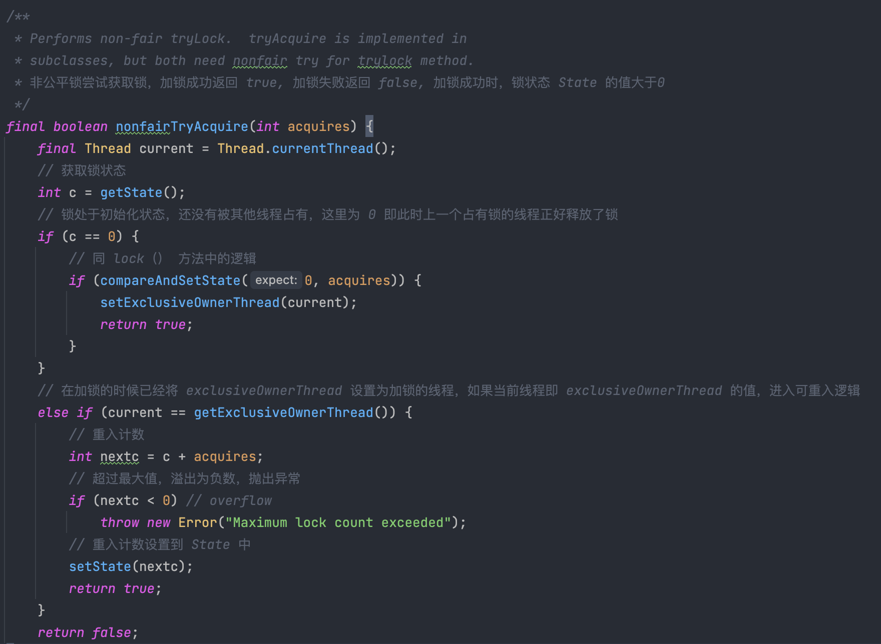该方法在 AQS 篇章有讲过,首先是调用 tryAcquire() 尝试获取锁,我们看其最终调用的逻辑 nonfairTryAcquire()。