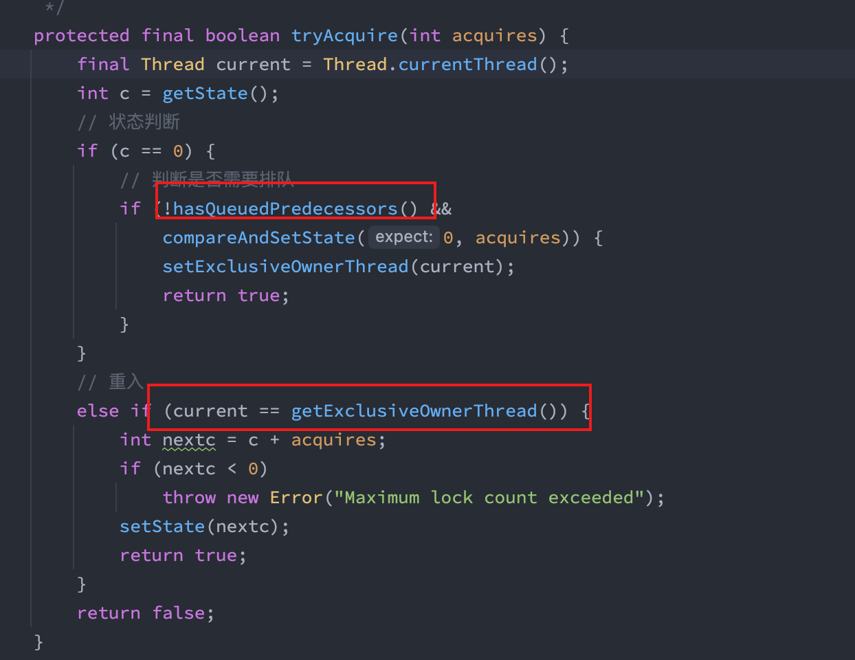 - 回看 tryAcquire() 方法,有些同学可能会疑问为什么判断排队时还需要确定当前线程是否重入呢?重入逻辑不是在 tryAcquire 中有实现吗?