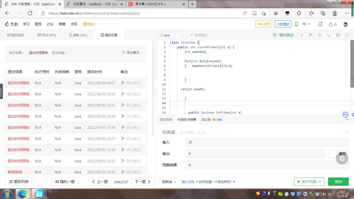 编程:计数质数,本来想通过枚举法实现的,但发现这种常规的办法超时,但官网也有枚举法,只不过它通过两个函数实现,一直找差别,最后把答案粘上去都没通过,或者说是要通过其它的方法。