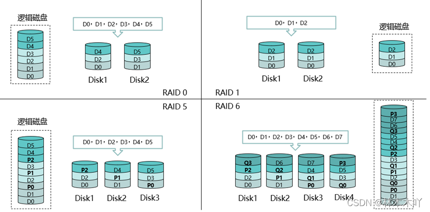 RAID0: Also called striping . Logic multiple hard disks into one hard disk for use , At least one hard disk is required , The capacity is equal to the total capacity of all disks , But the security remains the same , The reading and writing speed increases the most