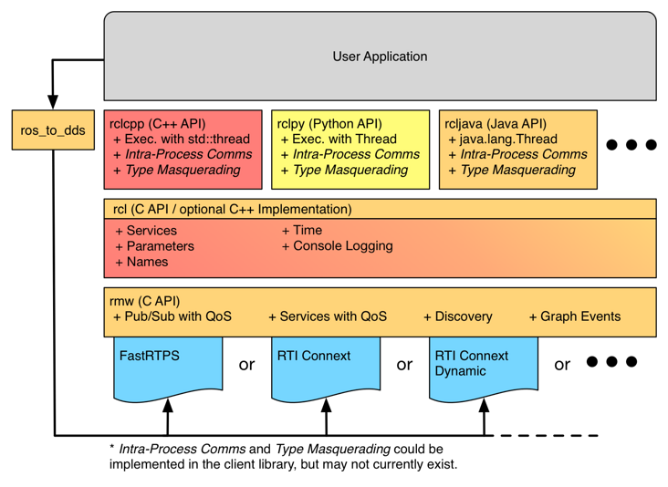 ROS 2 Fully support Python 3, And based on modern C++ To write . And based on its loose coupling mode , And support Java and Rust Programming language . Here's the picture User Application The next line shows , As long as developers are willing to , Can support any programming language .