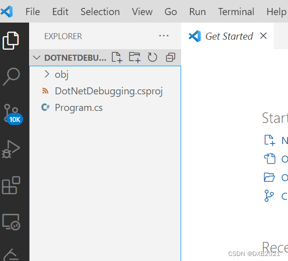 此命令会在文件夹中创建一个 Program.cs 文件(内附已编写的基本“Hello World”程序)。 它还将创建一个名为 DotNetDebugging.csproj 的 C# 项目文件。