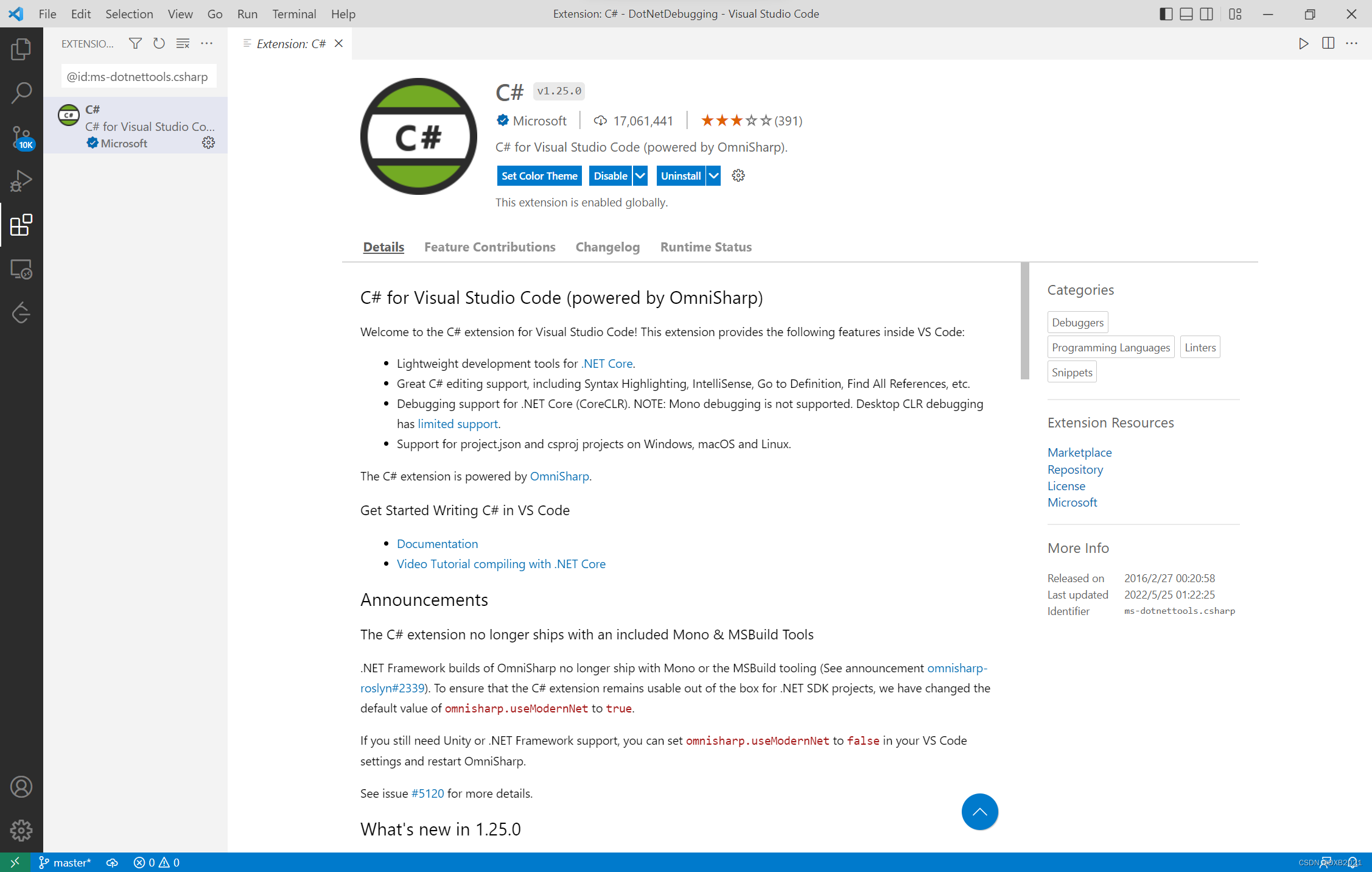 输入“@id:ms-dotnettools.csharp” ,直接安装 C# 扩展。