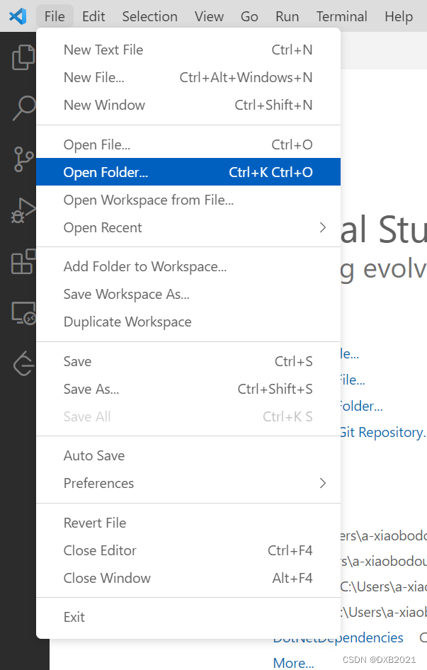 在 Visual Studio Code 中,选择“文件”>“打开文件夹”。