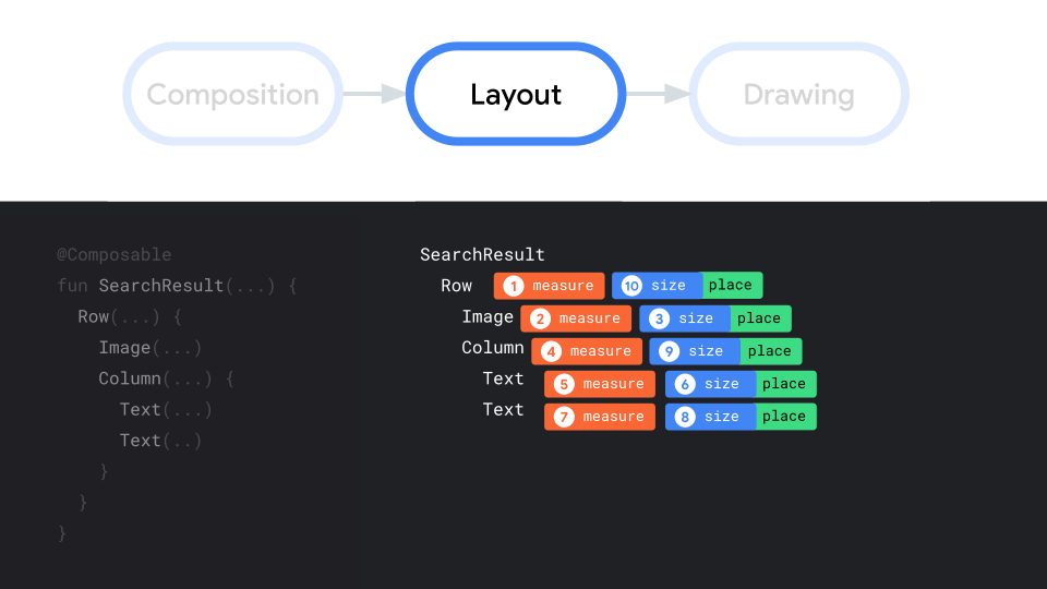 Jetpack Compose 的布局模型通过单次传递即可完成界面树的布局,其传递方式和原生 View 体系一样是通过递归的方式来实现。首先,系统会要求每个节点对自身进行测量,然后以递归方式完成所有子节点的测量,并将尺寸约束条件沿着树向下传递给子节点。再然后,确定叶节点的尺寸和放置位置,并将经过解析的尺寸和放置指令沿着树向上回传。简而言之,父节点会在其子节点之前进行测量,但会在其子节点的尺寸和放置位置确定之后再对自身进行调整。