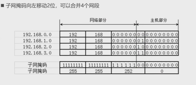 - 第一个网段的网络号以二进制00结尾,那么由它开始连续的4个网段,能通过左移2位子网掩码进行合并