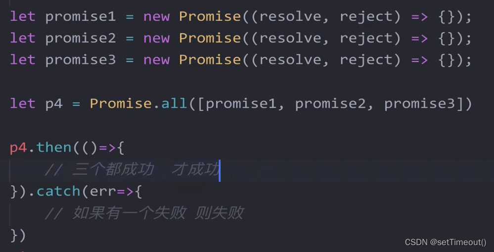 有时候会有多个Promise,比如在游戏控制的时候,Promise1是图片加载,Promise2是flash加载,Promise3是静态资源加载,要求当三个都加载完成之后再进行页面的初始化,这个时候就要用到all()方法,总结就是异步并行操作。