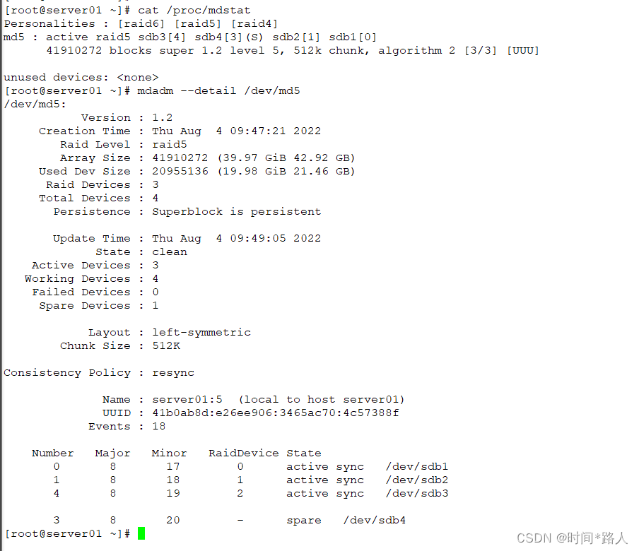 创建/dev/md5 RAID级别为5 活动磁盘目录为3 备份磁盘为1 使用/dev/sdb磁盘1-4