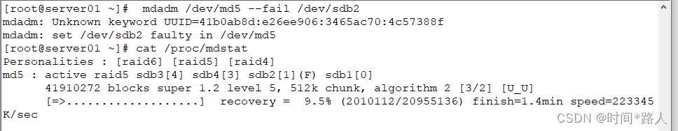 cat /proc/mdstat输入命令将/dev/sdb2标记为故障磁盘,查看时RAID正在重建磁盘将备用磁盘顶替故障的磁盘