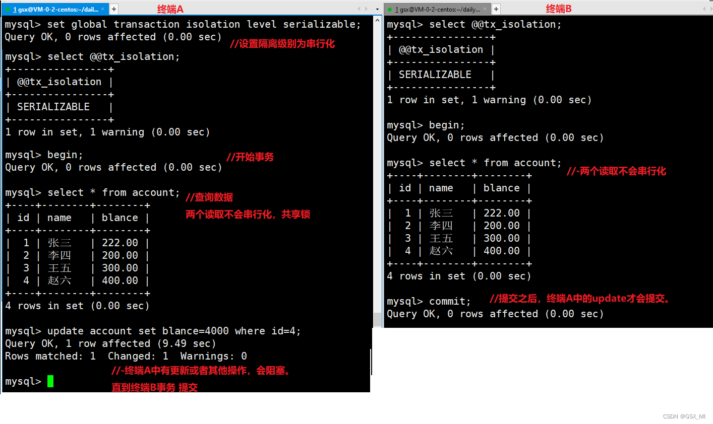 - 多次查看,发现终端A在对应事务中insert的数据,在终端B的事务周期中,也没有什么影响,也符合可重复的特点.但是,一般的数据库在可重复读情况的时候,无法屏蔽其他事务insert的数据(为什么?因为隔离性实现是对数据加锁完成的,而insert待插入的数据因为并不存在,那么一般加锁无法屏蔽这类问题),会cause although most of the content is re-readable,但是insert的数据在可重复读情况被读取出来,导致多次查找时,会多查找出来新的记录,就如同产生了幻觉.这种现象,叫做幻读(phantom read).很明显,MySQL在RR级别的时候,是解决了幻读问题的(解决的方式是用Next-Key锁(GAP+行锁)解决的).