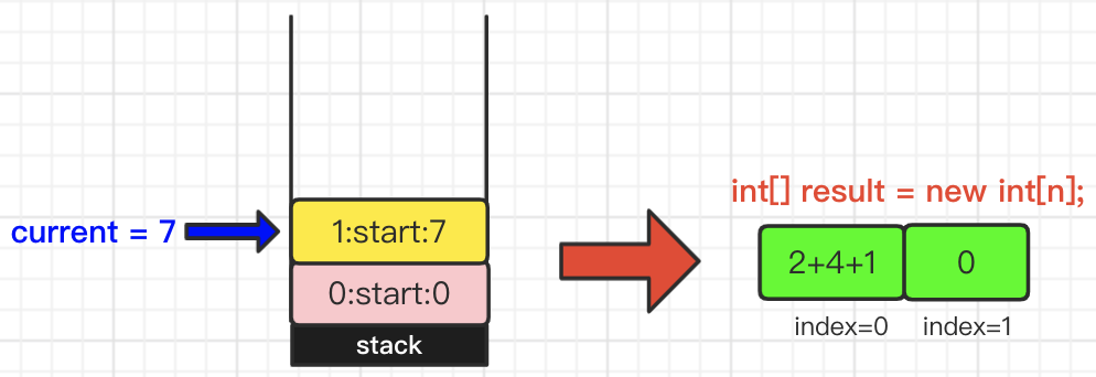 Get the second command log“0:start:2”,由于还是start指令,所以,Put it on the stack.But this time because it was executed againstart操作,So the first command is actually in a suspended state,由于我们采用“今朝有酒今朝醉”的方式.所以,Calculate the time taken to execute before pausing,并维护到result结果数组中;第二个startThe timestamp of the instruction is2,So the first instruction is executed2time units are then paused.此时result数组中,index=0的元素被赋值为2.由于currentThe pointer points to the starting position that is not involved in the calculation,所以current被赋值为2.具体操作如下所示: