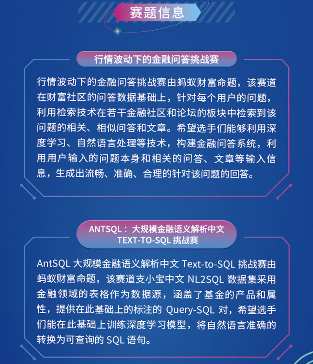 可个人参赛,也可组队参赛(每支队伍 1 - 3 人为佳),每人限加入一支队伍. 大赛主办方和技术支持单位有机会接触赛题背景业务、产品、数据的员工,会自动退出比赛,放弃参赛资格.