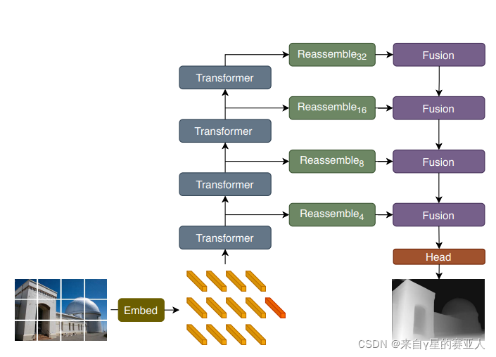 首先,输入图像通过提取非重叠块然后对其扁平表示(DPT-Base 和 DPT-Large)进行线性投影或通过应用 ResNet-50 特征提取器(DPT-Hybrid)转换为标记(橙色);