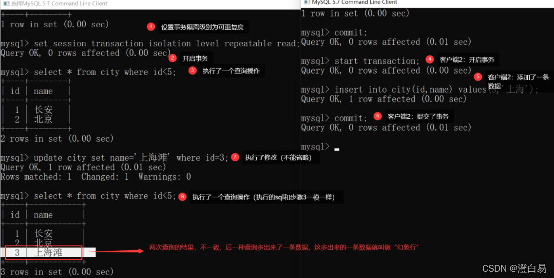 - Repeatable (REPEATABLE READ): yes MySQL Default transaction isolation level for , It ensures the same as ⼀ The transaction is queried multiple times result ⼀ Cause . But there will also be new problems ,⽐ For example, level transactions are being executed ⾏ when , another ⼀ A transaction was successfully inserted ⼊ A certain number According to the , But because the result of every query is ⼀ What kind of , Therefore, this data will not be queried ,⾃⼰ Repeat the insertion ⼊ when ⼜ Failure Because only ⼀ The reason for the constraint ). Obviously, this information cannot be queried in the transaction , but ⾃⼰ Just plug in ⼊ Don't go in , This is called Fantasy reading (Phantom Read).