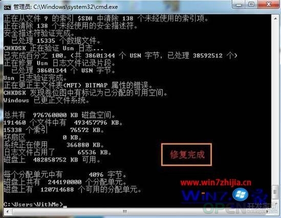 2、输入“chkdsk H:/f”这里修复的H盘,修复D盘就是“chkdsk D:/f”,System starts repairing,过一会儿就修复完成了;