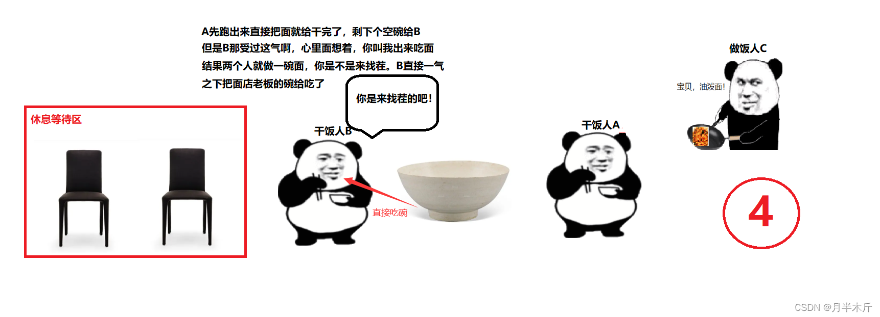- Counterexample code demonstration :( But this program is very expensive cpu Resources , Suppose that the time slice obtained by a thread at this time is 200ms, Then he judged in this time slice , If there is no noodles in the current bowl, then he will continue Exit this cycle , But its time slice is not over yet , Then he will lock it again to judge whether there is noodles in the current bowl , But not yet , At this point, it exits this cycle again and then locks the lock , But now its time slice is used up , Get the mutex when the next thread wants to execute , But at this time, the mutex is not released , So at this time, the thread has to repeat the judgment , But after its time slice is consumed, the mutex is also closed , So the judgment is invalid , Then in this time slice, what this process does is meaningless , Then it will be a waste of time , And didn't do anything . So it will lead to inefficiency ).