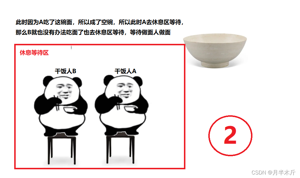 - Thread after locking , Determine whether the lower critical resources are available ( It's like after you get the bowl , Can you make noodles , Is whether there is noodles in the current bowl , If there is no face , Then you can make noodles , If you have noodles, you can't make noodles , Release the mutex and wait , The same goes for noodles ):