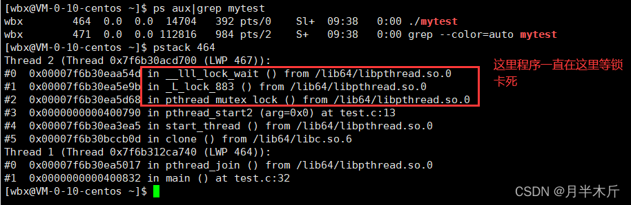 - Let's look at the call stack of the process , You can see that there is only one thread , And the thread has been waiting for the lock . But the locking process has locked the lock , And quit , Then the lock will be locked forever , This situation is called deadlock .