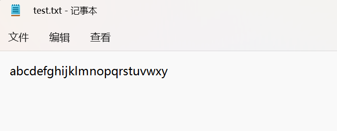 #include <stdio.h> int main() { FILE* pf = fopen("test.txt", "w"); if (pf == NULL) { perror("fopen:"); return 1; } for (char i = 'a'; i < 'z'; ++i) { fputc(i, pf); } fclose(pf); pf = NULL; return 0; }运行完我们打开文件时,就发现字母全部输入进入文件中了