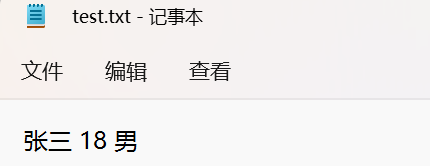 #include <stdio.h> struct Person { char name[10]; int age; char sex[4]; }; int main() { FILE* pf = fopen("test.txt", "wb"); if (pf == NULL) { perror("fopen:"); return 1; } struct Person p = { "李四",18,"男" }; fwrite(&p, sizeof(struct Person), 1, pf); return 0; }写入的是以二进制的性质,但是中文的二进制还是中文。