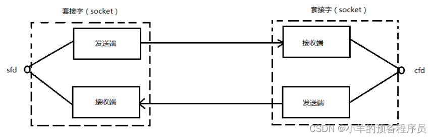 在网络通信中,套接字一定是成对出现的。一端的发送缓冲区对应对端的接收缓冲区。我们使用同一个文件描述符索发送缓冲区和接收缓冲区。