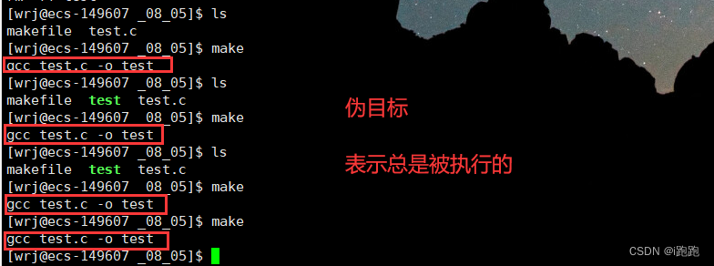 上图中目标 test 未被 .PHONY 修饰为伪目标,那么他不会一直执行: