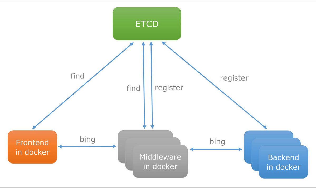 随着Docker容器的流行,多种微服务共同协作,构成一个相对功能强大的组织架构。使用etcd服务发现机制,在etcd中注册某个服务名字的目录,在该目录下存储可用的服务节点的IP。服务使用者从etcd目录下查找可用的服务节点IP来连接和调用,达到透明化的动态添加这些服务目的,示意图如下图所示: