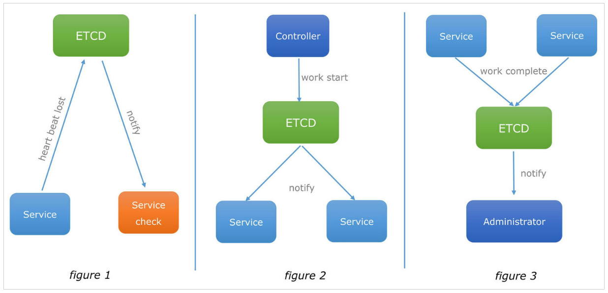 - 一种注册服务和监控服务健康状态的机制。用户可以在etcd中注册服务,并且对注册的服务设置key TTL,定时保持服务的心跳以达到监控健康状态的效果