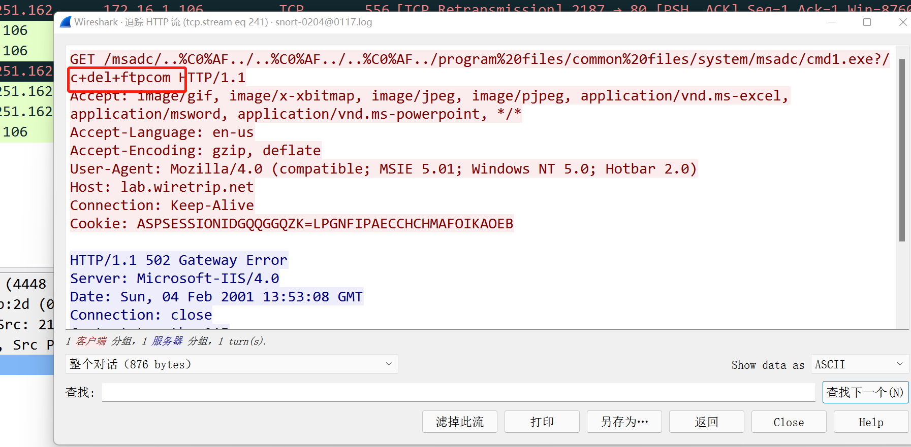 - 继续查看http数据流,发现删除了ftp的文件,猜测攻击者删除了之前下载的文件,准备溜走。