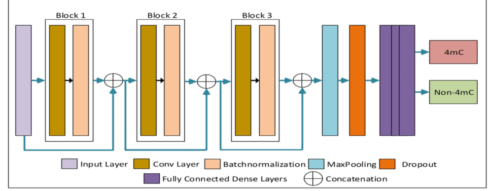 这篇文章设计出了一种,基于神经网络的工具,命名为为DCNN-4mc,用于识别4mc位点。模型包括彝族具有跳跃链接的神经网络层,其允许与密集层共享浅层特征。跳过连接允许收集关于4mC站点关键信息。用了12种数据集。
