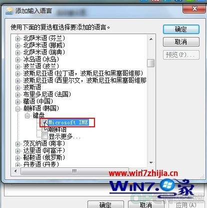 3、点击:“添加”之后会出现选择语言的这个复选框,找到“朝鲜语”,选择“键盘”选项中的“Microsoft IME”这个,再点击“确定”就完成了;