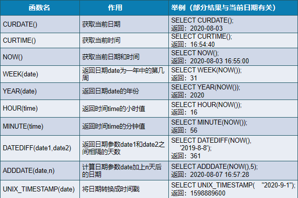 CURDATE() Get current date SELECT CURDATE(); return :2016-08-08 CURTIME() Get the current time SELECT CURTIME(); return :19:19:26 NOW() Get the current date and time SELECT NOW(); return :2016-08-08 19:19:26 WEEK(date) Return date date For the week of the year SELECT WEEK(NOW()); YEAR(date) Return date date A year of SELECT YEAR(NOW()); HOUR(time) Return time time The hour value of SELECT HOUR(NOW()); DATEDIFF(date1,date2) Returns the date parameter date1 and date2 The days between SELECT DATEDIFF(NOW(),'2008-8-8'); return :2881