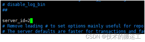 # server_id 任意配置,只要是数字即可# server_id Master 唯一标识数字必须小于 Slave 唯一标识数字.server_id=2