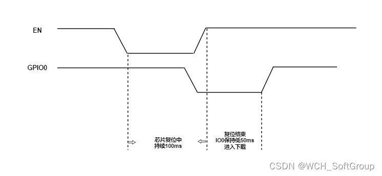 MCU Reset for low level , Hardware needs to meet MCU Enter automatically after reset “ Serial download ” Pattern . Download timing diagram :