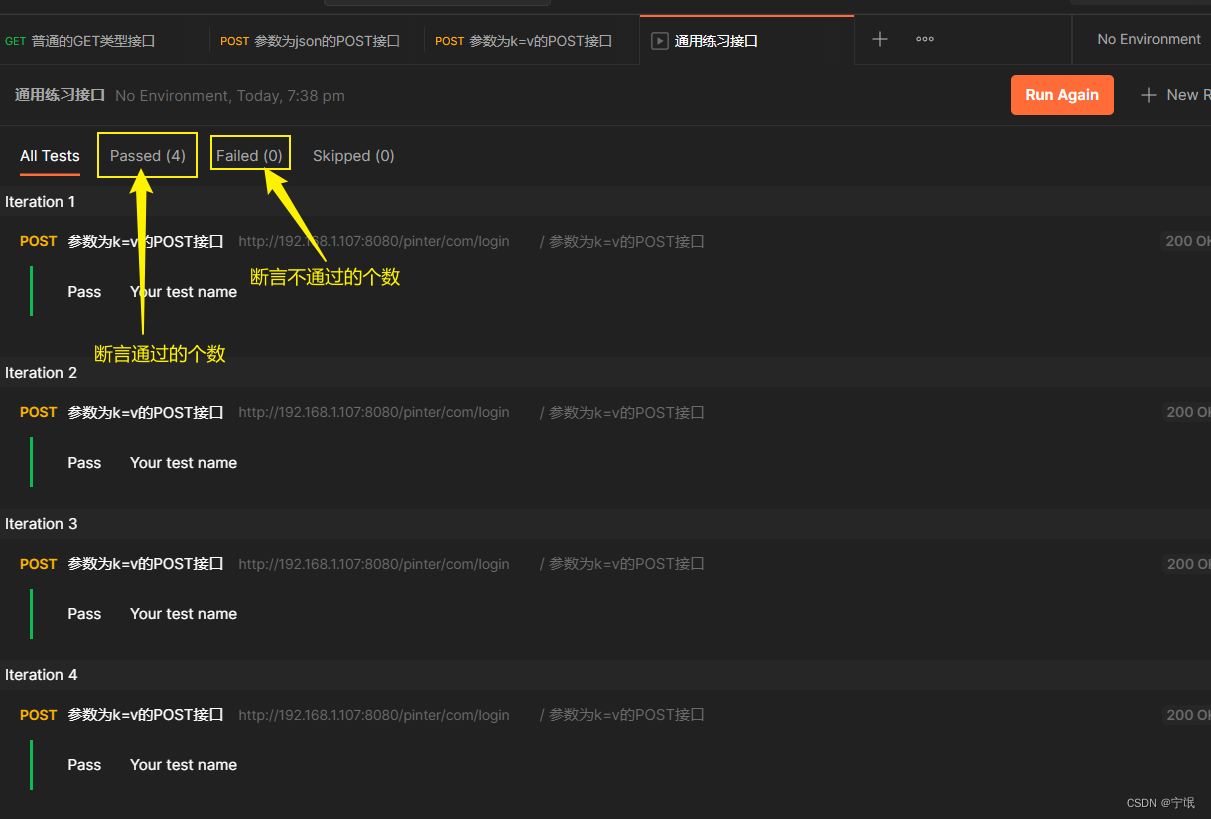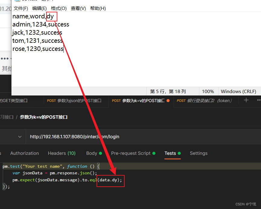 2) In postman, change the value in key-value to {{variable name in the file}} format, in the post-processor tests, use the value of the data file in the assertion: data.field name