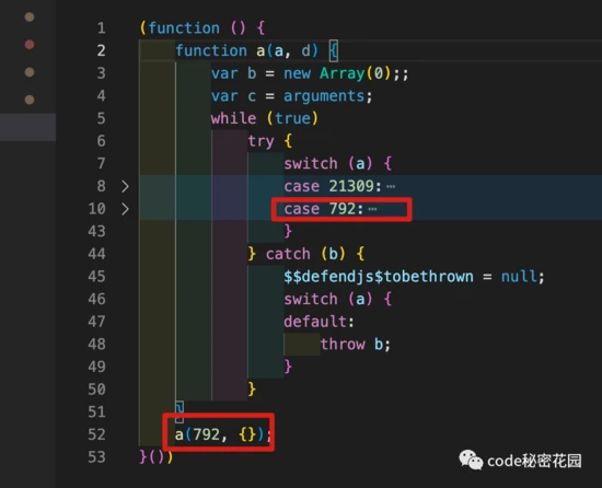最顶层包了一个 IIFE,然后有一个 a 函数,a、b 两个参数。调用 a 函数时只传入了第一个参数 792,然后就会发现 a 函数里有个 switch 语句,只会执行到第二个 case,里面是这样的语句: