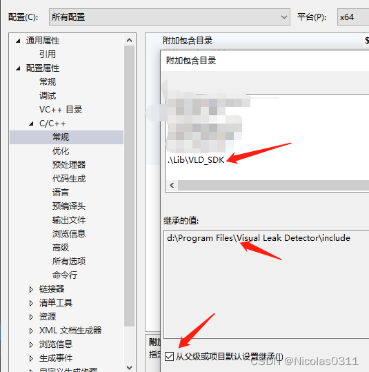 下图中,第一个种方法,如第一个箭头所指,把打包的VLD_SDK库目录添加进来。第二种方法,如果能看到第二个箭头这里,有继承的值,因为安装VLD的exe后,系统继承了对应的环境变量路径。可以直接勾选第三个箭头即可。