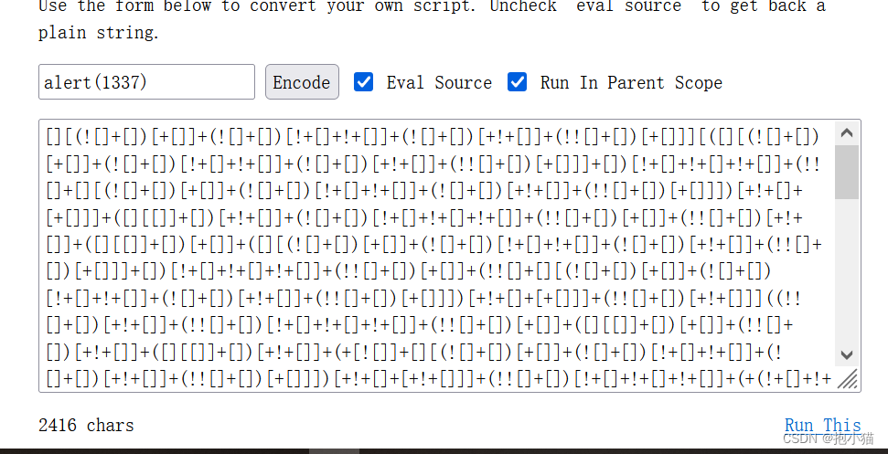 eval(balls)将[A-Za-z0-9]都进行了过滤,We cannot use letters nor numbers,At this time we can use another special encoding method:JSFuck - Write any JavaScript with 6 Characters: []()!+