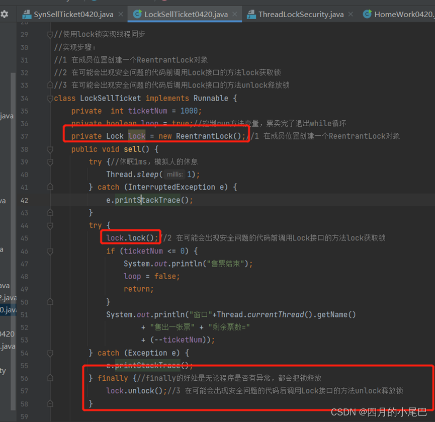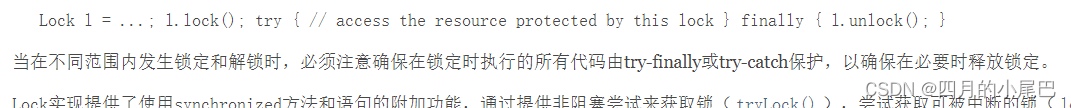 3 在可能回出现安全问题的代码后调用Lock接口的方法unlock释放锁