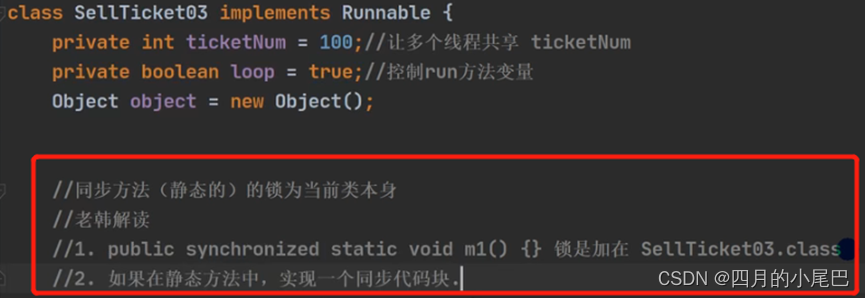 private static int ticketNum = 100;//让多个线程(3个sellTicket对象)共享ticketNum,所以用static