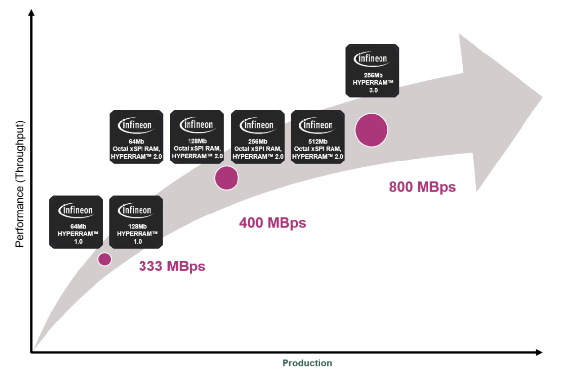 3、英飞凌推出第3代HyperRAM产品,16bit接口,速度高达800MB/S,符合 AEC-Q100 标准,支持高达 125°C 的工业和汽车温度等级