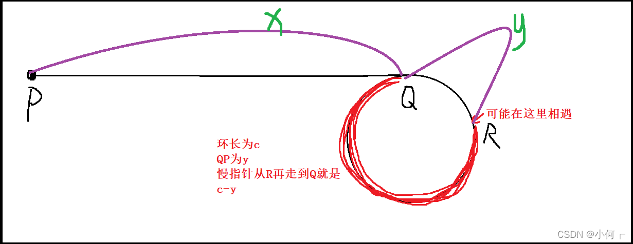 As shown in the figure , Starting from P, The intersection of the linked list and the ring is Q, The fast pointer and the slow pointer first met in R