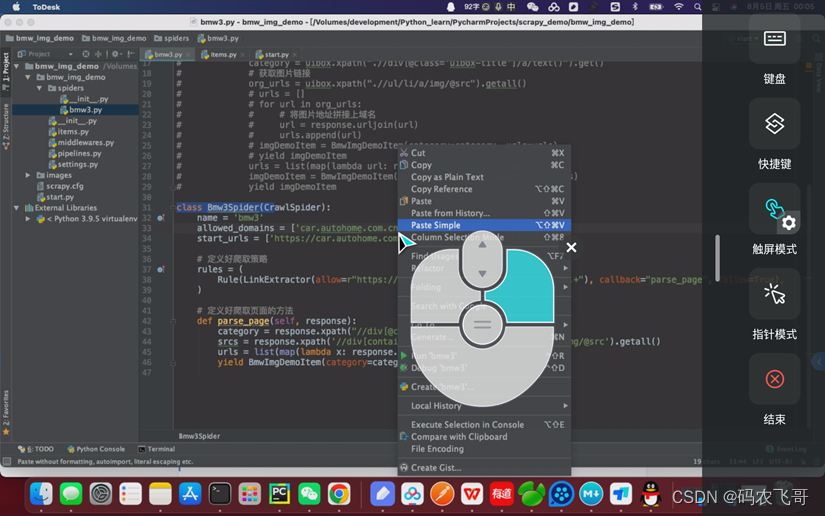 在侧边栏可以看到ToDesk 提供了键盘,快捷键,触屏模式,指针模式,鼠标设置,隐私屏等功能,其中操作模式分别是指针模式和触屏模式,默认情况下使用的是触屏模式。指针模式主要用于有鼠标的情况下可以使用。键盘则提供了输入能力可以向被控端输入文字。