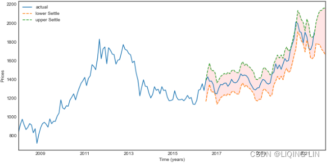 The start parameter in the get_prediction() method indicates we are performing an in-sample prediction of the most recent five years' prices. At the same time, with the end parameter, we are performing an out-of-sample forecast of the next five months